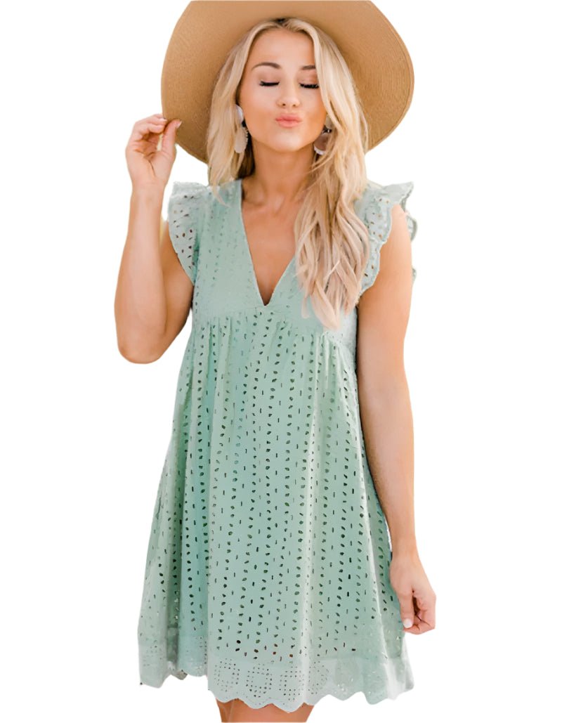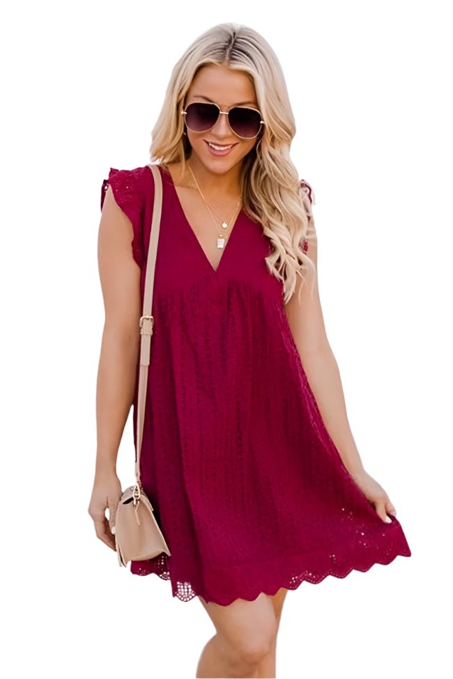 Crafted from a 65% cotton and 35% polyester blend, this dress offers a soft feel, a slim fit, and a fluid drape. Its V-neck, flattering high waist, and openwork jacquard details give it a sophisticated and feminine look.