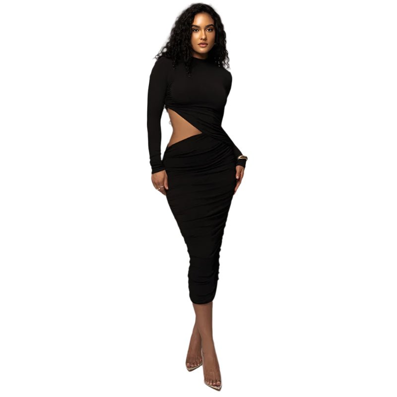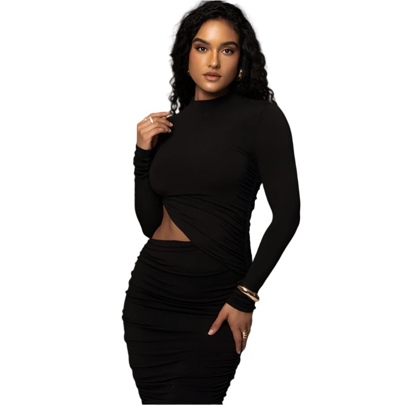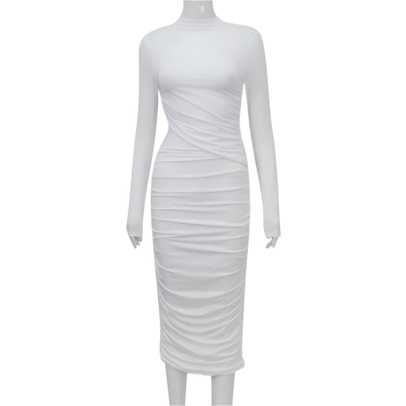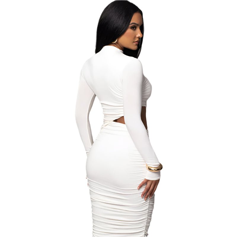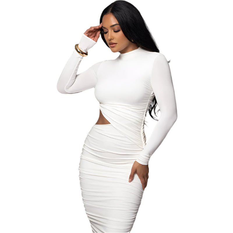 Adopt an irresistible look with this mid-length one-piece dress, with long sleeves, in refined urban style. Its ro high waist and body-hugging cut flatter the silhouette, while pleated and hollowed out effects add a modern and sensual touch. Made of polyester and elastane for optimal comfort. Sizes available: S, M, L. Colors: white and black.